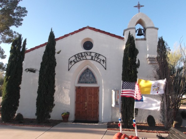 first day from Nutrioso in November. The Winds are 25-30mph straight head on. My first indication this was going be a long day was the 2.5 hours, of hard peddling in low gears against the wind a very slight incline to just make to Church at Santa Rita Shrine in Vail, AZ at 8:00am. What a relief to get out the wind and feel the grace of God for today. This church has a really interesting history as noted on a newspaper article framed in the back of church. It was built for the Mexican population in the Vale, AZ area to attend catholic mass. The widow of the 1890’s Japanese Scientist who discovered Ad reline in the Japan. Mr. Tanakama visited the USA, fell in love with an American woman, married her in 1897 and moved to Japan. In the 1910s He and wife moved to New York. Mr. Tanakama, who was raised Buddhist converted to Catholicism. Sometime after his death in 1922, his widow married a rancher from the Vail, AZ area. Together she and her second husband built this Catholic Church in memorial to her first husband and named it after Saint Rita in 1935. Saint Rita is known as the patron of the impossible similar to the more widely knows Saint Jude.