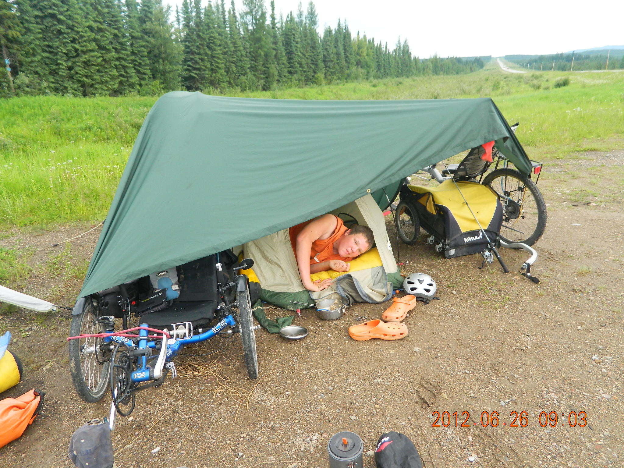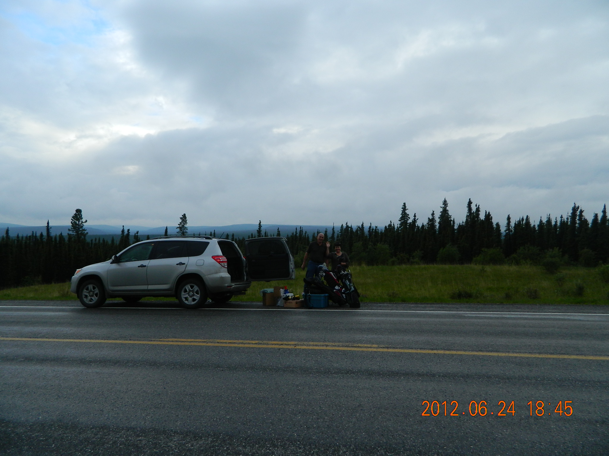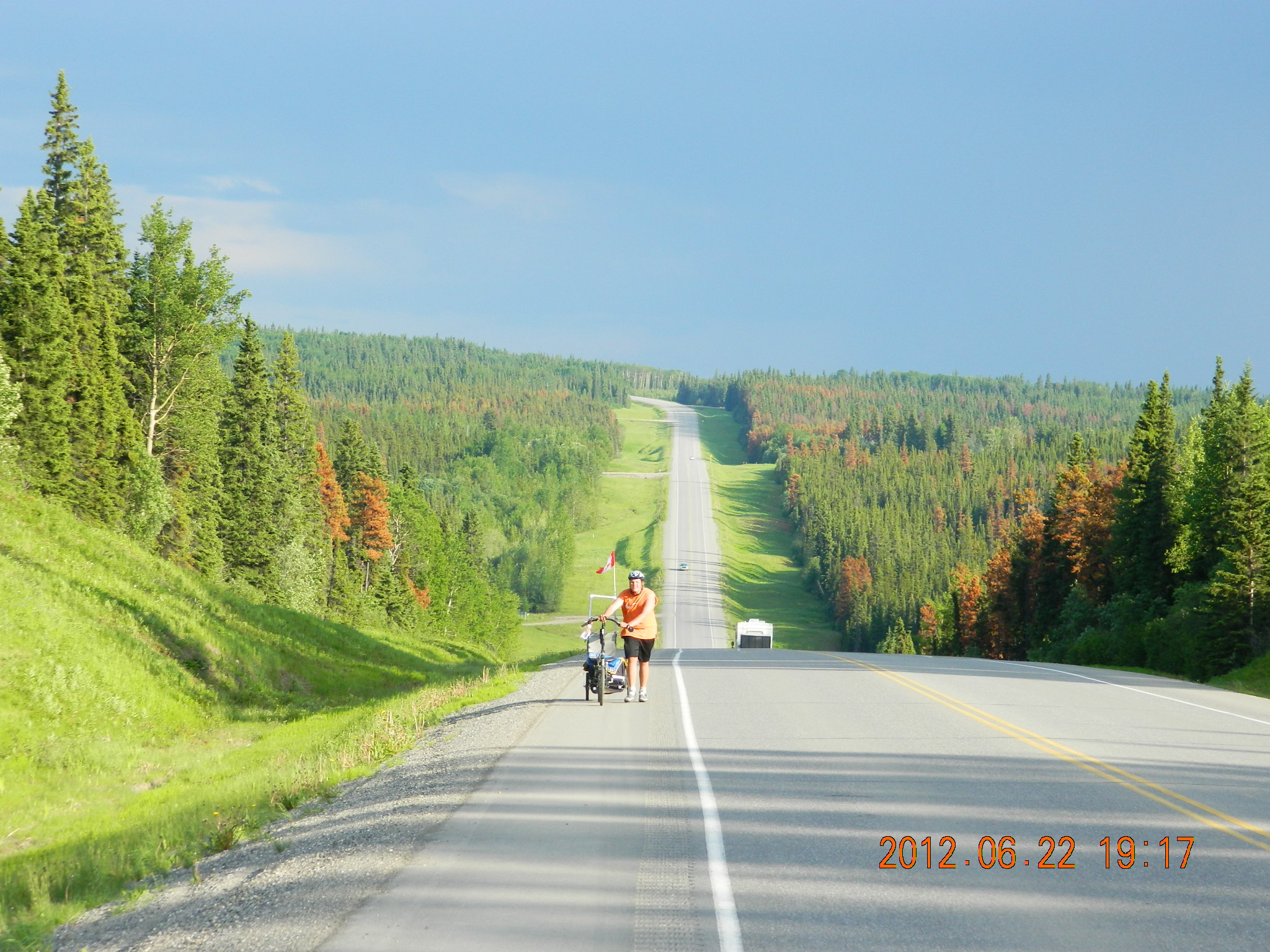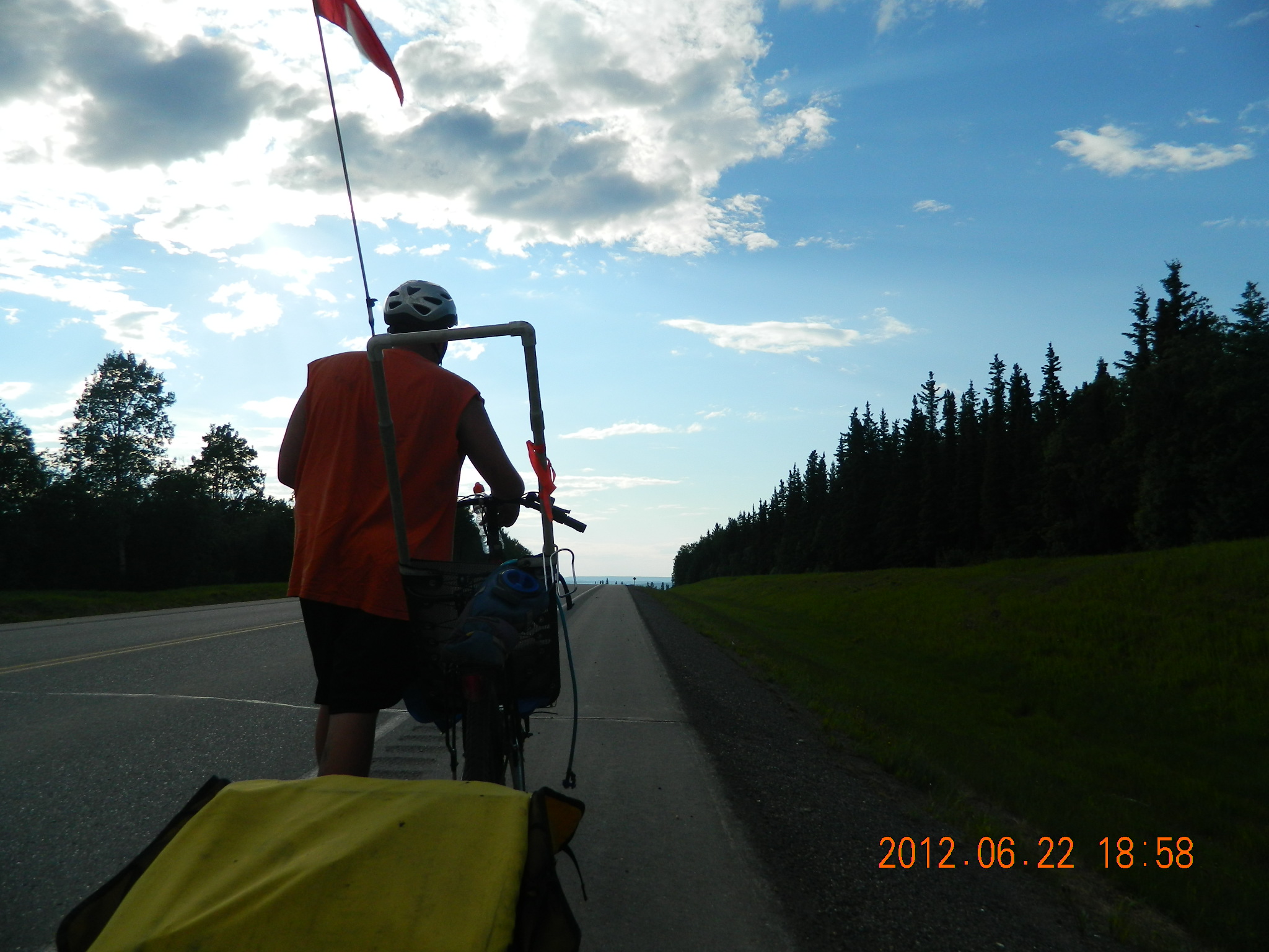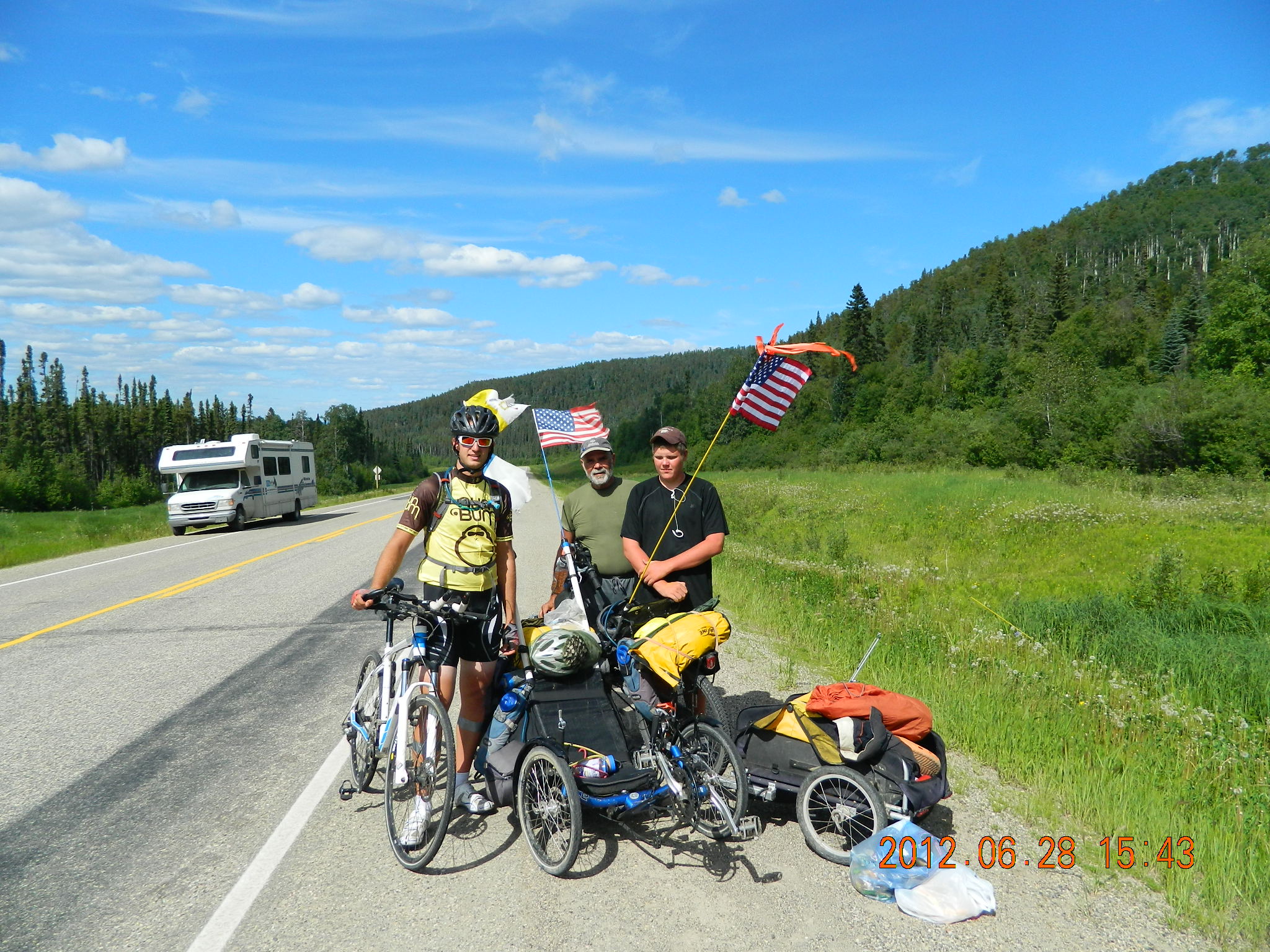 Papa Mike Fox and his 14 yr old grandson Michael Pruiett are riding bicycles to Fairbanks, Alaska from the USA/Canada border. They are currently traveling up the Alaska Highway and have gone over 1,100 miles and are 500 miles up the Alaska Highway. The remoteness and prices for supplies as well as rain incurred lodgeing have exceeded the budget. Any donations to help defray expenses will be appreciated – a hamburger for Michael up here is $15.00 drink extra. Today buying supplies for the Whitehorse, Yukon Territories came to over $200 and most was Ramon Noodles and peanut butter and Jelly.