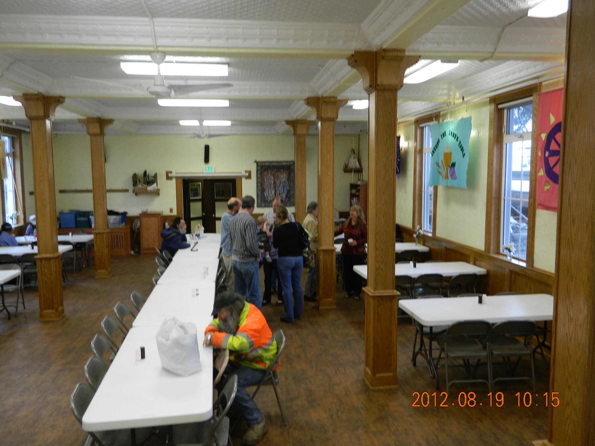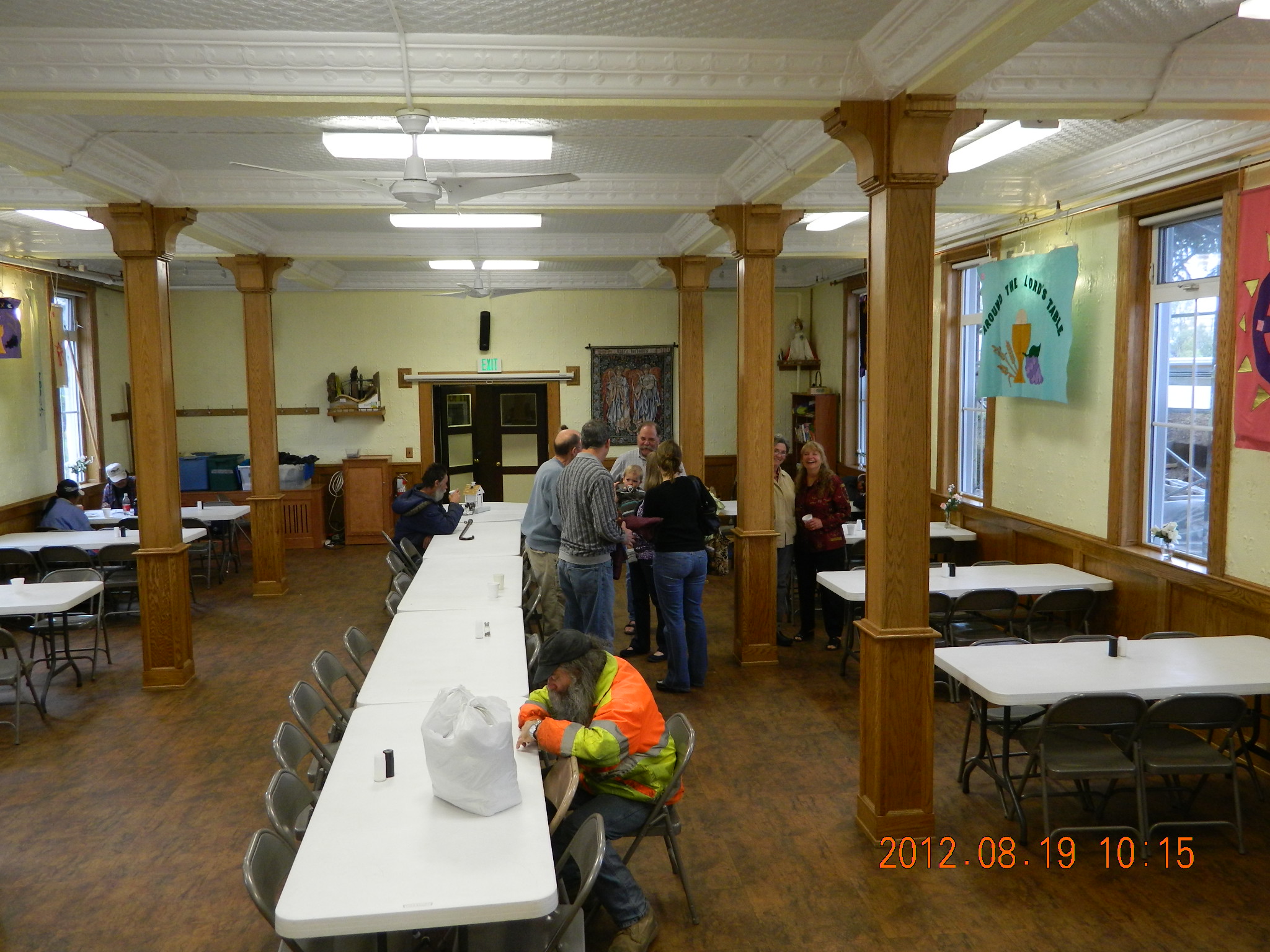 - Sunday Morning after the 7:30am mass at Coffee and Donuts. Everyone here has been so out reaching – well most everyone the fellow in the orange vest is one of those being reached out to as well as me. By the way after lunch yesterday with this fellow, I went to the Barbershop and asked to be made less homeless looking. The barber got a kick out of that and I got a really short haircut and beard.