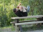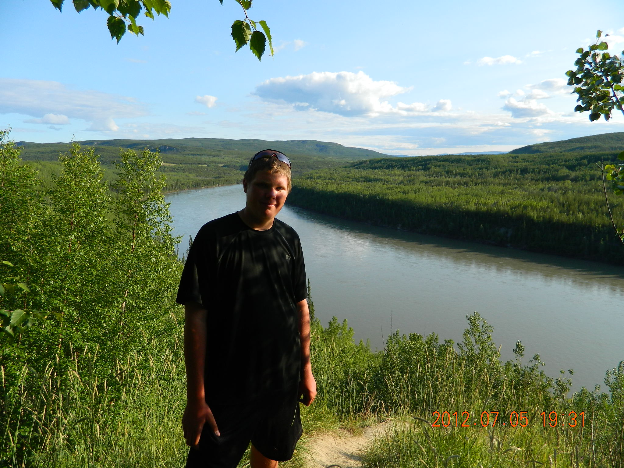 - The Smith lookout over the Laird River – we are camping for the night – Michael looks a little tired – he did win the marker race but only by 2 out of 12 possible.