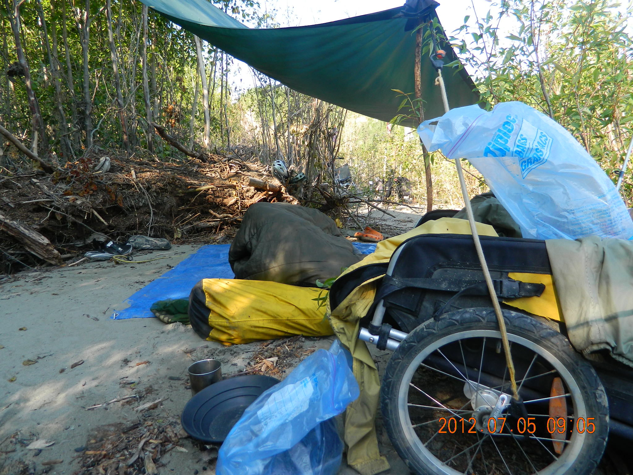 - Morning on the Coal River – Michael slept under the tarp and during the night had to get up to put on his head net to keep the Mosequetoes off his face.